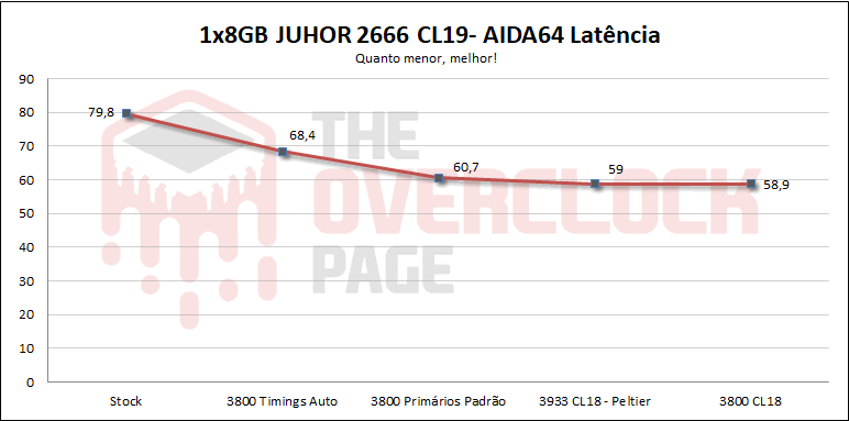 A memória baratinha da Juhor sobreviveu aos testes com temperatura abaixo do ambiente, apresentando estabilidade com 3933 MHz, um claro ganho em relação aos 3800 MHz de antes, porém, não foi possível melhorar timings e tampouco essa memória escalou com mais tensão, parecendo ser algo característico aos desconhecidos chips utilizados.