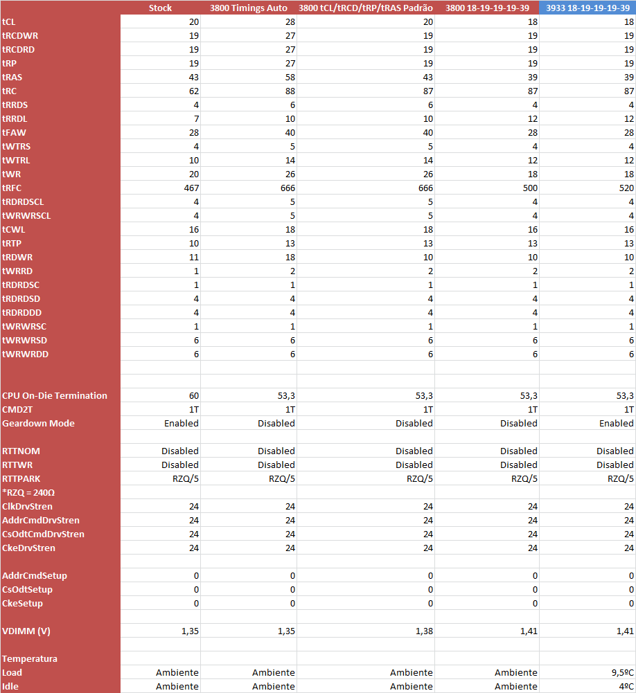 Como ponto de partida foram adotados os timings obtidos manualmente no review dessa memória e a partir deles, foram feitas tentativas de ir além daquilo que foi obtido com temperatura ambiente, ou seja, 3800 18-19-19-19-39.