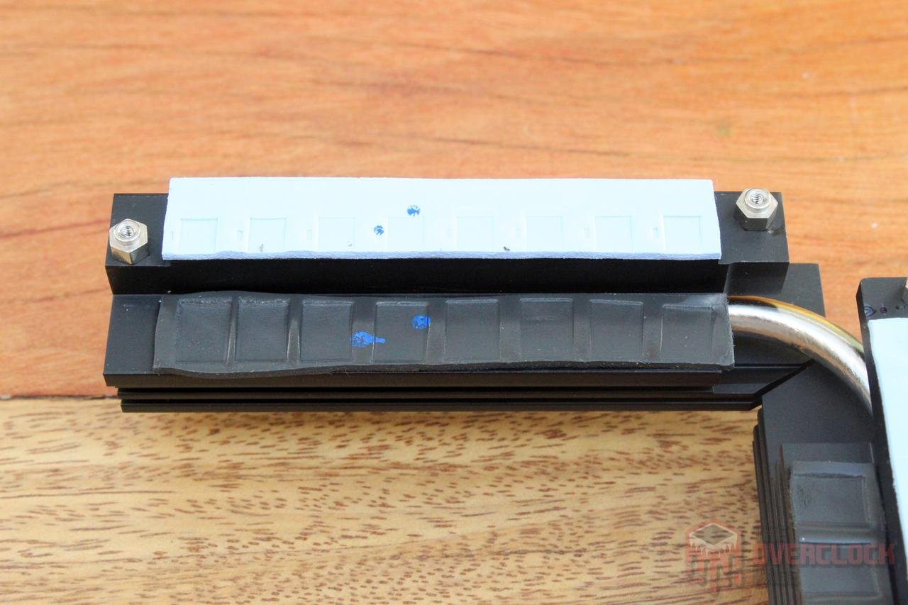 Para a B650M Aorus Elite AX, o fabricante optou por incluir um robusto dissipador no VRM, o qual é composto de duas peças de alumínio com aletas e ligadas por um heatpipe (!), algo que só costumamos ver em modelos mais sofisticados. Sobre o ‘thermalpad’, ele propicia contato ótimo com os componentes e segundo a GIGABYTE, é de 5 W/mk.