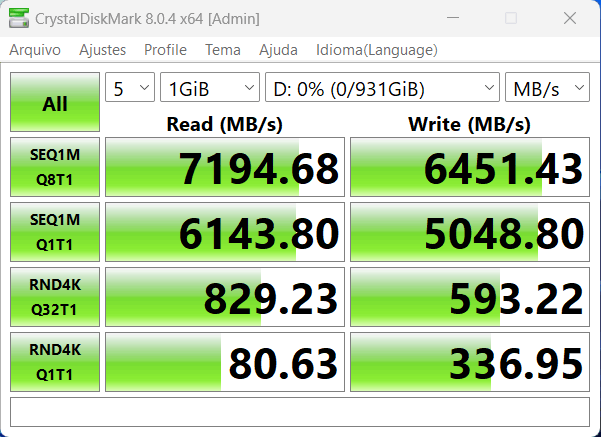 Já para verificar o desempenho das M.2, foi utilizado o Crystalmark 8.0.4, contudo, é necessário ressaltar que por não dispormos de um SSD PCI-E 5.0, não foi possível verificaro limite da M2A_CPU, que suporta esse padrão.