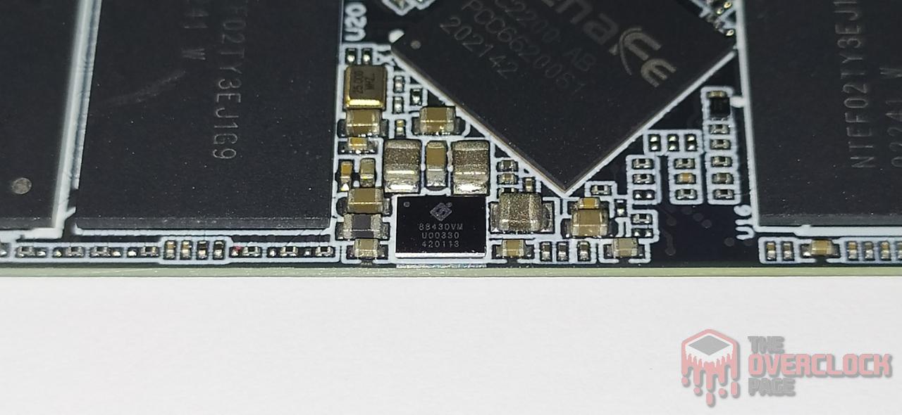 Ele acompanha por padrão um volume de 9.9% alocado para over-provisioning, e em seu PCB Frontal encontramos 6 chips principais, 4 NAND Flashs, um controlador e seu PMIC.