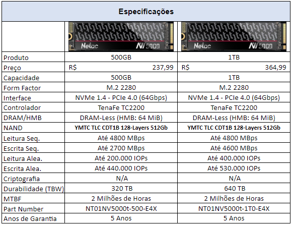 Ele vem no formato M.2 com barramento de 64Gbps, ou seja, 4 linhas PCIe 4.0, protocolo NVMe 1.4 e capacidades que variam desde 500GB até 1TB, infelizmente não há versões de 2TB até o momento desta análise. Seu preço geralmente se encontra próximo dos R$364,99, na unidade de 1TB, enquanto a unidade de 500GB, encontra-se um pouco mais barata, cerca de R$238.