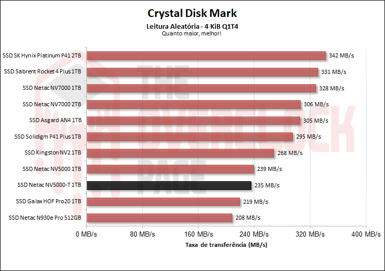 Ao testarmos suas velocidades aleatória em ‘Queue depth’ de 4, observamos que em sua leitura há basicamente um empate técnico entre NV5000 e NV5000-T o que é um ponto positivo. Entretanto, suas velocidades aleatórias de escrita foram quase a metade do NV5000, um péssimo resultado.