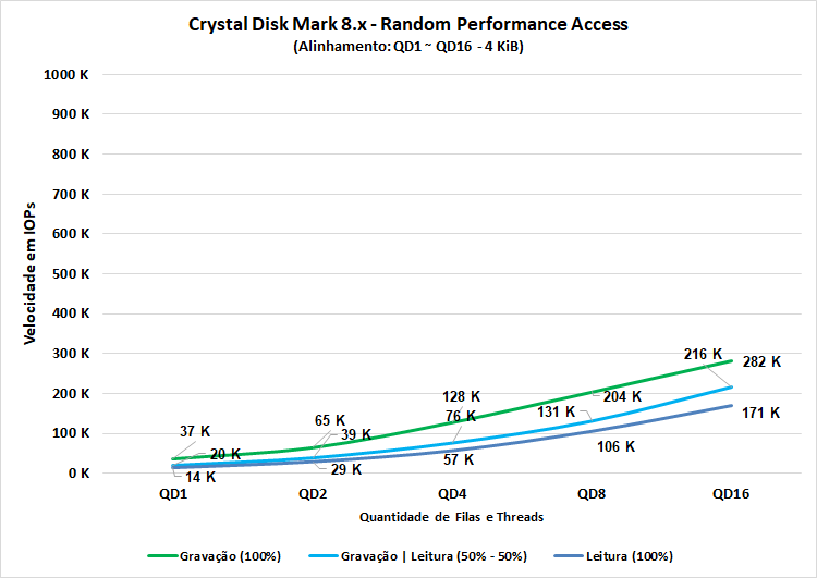 Neste teste, foram feitas 3 configurações de acessos entre diversas configurações de queue depth desde QD1, que representam um uso do dia a dia, quanto QD16, que já se torna bem surreal, mais comparável com ambientes virtualizados.