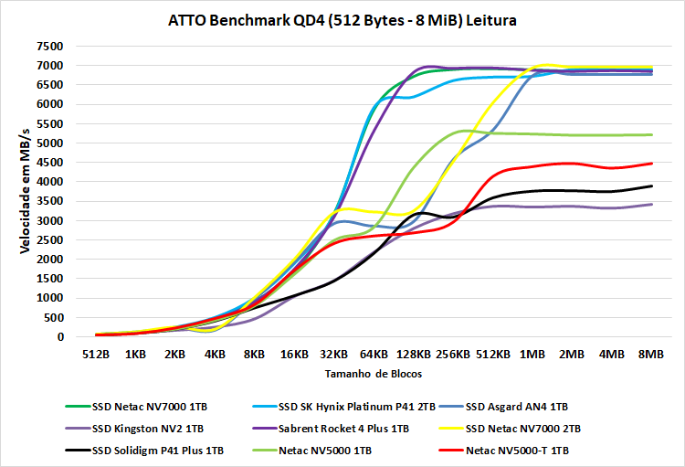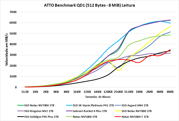 O ATTO Disk Benchmark é um software que faz um teste de velocidade sequencial com arquivos comprimidos, ou seja, para uma simulação em uma carga de transferência de dados como no Windows, geralmente vemos algo em torno dos blocos de 128KB à 1 MiB, agora, em blocos de menor tamanho, ele oferece um desempenho semelhante aos demais SSDs, conforme os blocos vão aumentando conseguimos ver a real diferença e neste teste, mesmo no quesito de leitura, o NV5000 consegue se distanciar bem do NV5000-T.