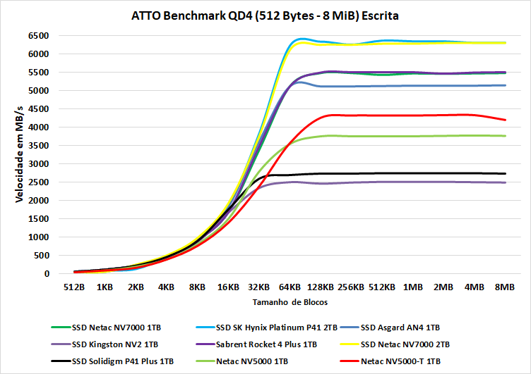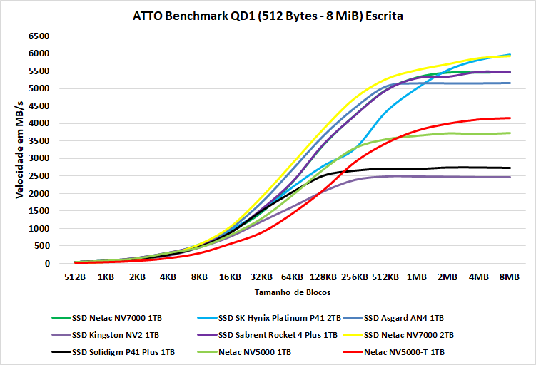 Curiosamente, no cenário de escrita, o NV5000-T retoma a liderança a partir de 128KB até o fim do teste.