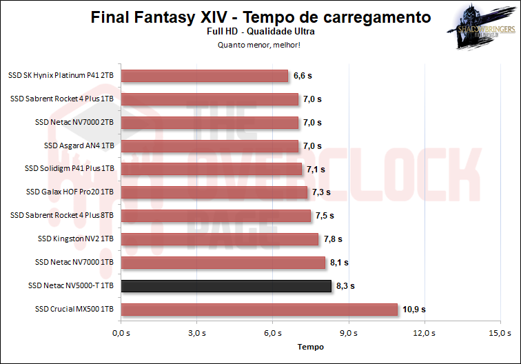 Neste game vemos que o NV5000-T apresentou o pior tempo dos SSDs NVMe, ganhando apenas dos SSDs SATA, mas novamente, a diferença dentre o melhor e o pior NVMe foi de apenas 2 segundos, portanto, não há o que reclamar neste cenário.