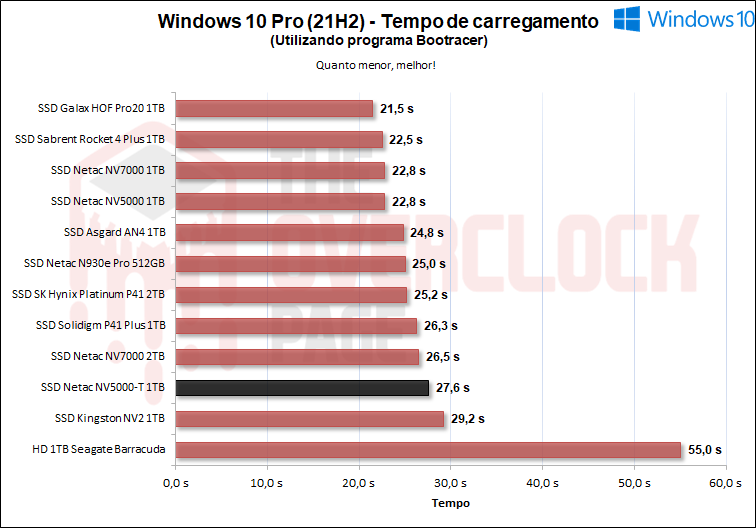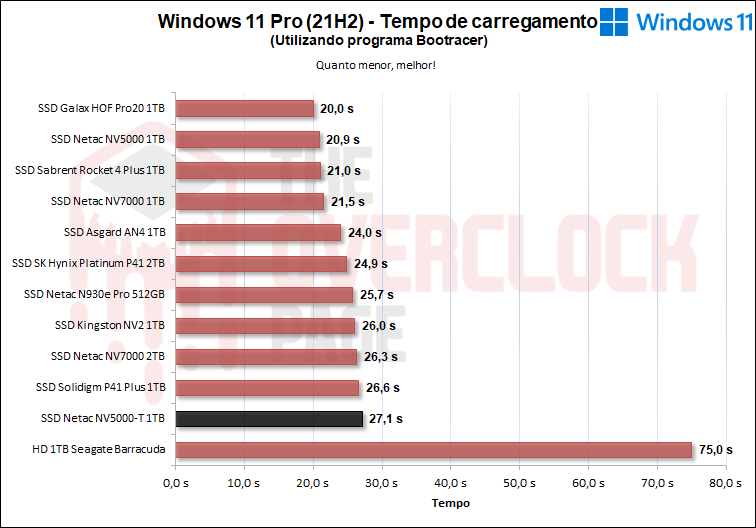 Neste programa, consta deste o tempo de boot até o carregamento dos últimos drivers do OS, o que neste caso, é feito uma instalação limpa com apenas drivers de sistema operacional, como de Rede, Wireless + Bluetooth, Áudio, Drivers Nvidia, PCH dentre outros, então, podemos observar que o NV5000-T apresentou resultados satisfatórios próximos de outros SSDs 4.0 de entrada como o P41 Plus e o Kingston NV2, entretanto ficando para trás do NV5000.