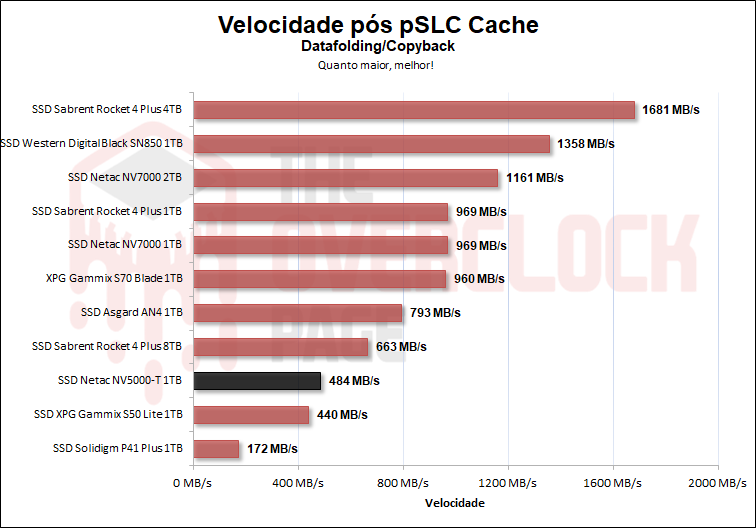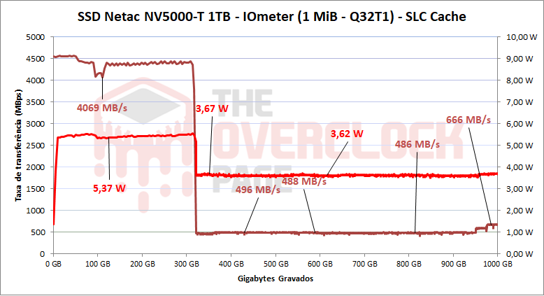 Após ter gravado 320GB, ele começou o processo de folding aonde reprogramou os blocos que estavam em modo pSLC de volta para TLC, resultado em uma queda grande de desempenho. O SSD manteve uma velocidade média de escrita de 484 MB/s até certa de 953GB.