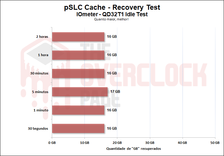 Realizamos também um teste para ver quanto tempo o SSD levaria para recuperar parte de seu Buffer e no decorrer da nossa bateria de testes, que dura de 30 segundos até 2 horas em idle, utilizando o TRIM e gargabe collection vs TRIM/GC não utilizados. Ao testarmos sem usar o TRIM/GC podemos observar que ele conseguiu recuperar cerca de 16GB à 17GB em cerca de 1 minuto em idle, infelizmente, mesmo após 2 horas em idle ele não conseguiu recuperar mais do que isto.