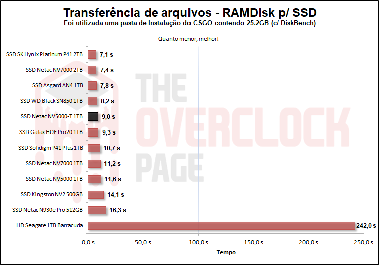 Neste teste, foi feita a cópia dos arquivos ISOs e do CSGO de uma RAM Disk para o SSD para ver como ele se sai. Foram utilizadas a ISO do Windows 10 21H1 de 6.25GB (1 arquivo) e sua versão extraída com o Winrar para uma pasta contendo 1.874 arquivos menores juntos da Pasta de instalação do CSGO de 25.2GB.