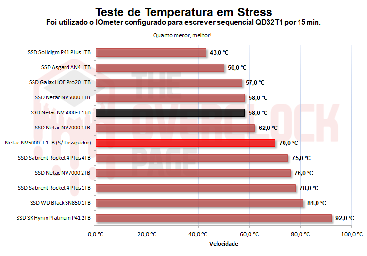 Como visto acima, este SSD por padrão possui um limite de limitação térmica de 100?°C, que é bastante alto, mas é inferior à especificação do controlador. Com o cooler de grafeno original, o disco atingiu um máximo de 58?°C usando uma sonda, já que a temperatura do disco, embora pareça precisa, para de registrar após 54?°C, o que é algo que eles deveriam corrigir.