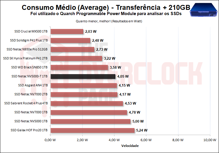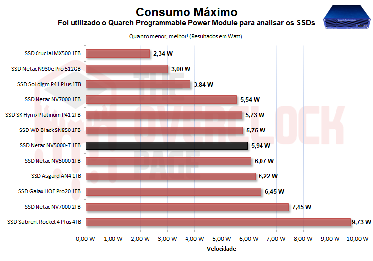 Com relação a seu consumo máximo, podemos observar que ele teve uma diferença quase imperceptível para o NV5000 o que foi um ponto negativo, pois se trata de um SSD DRAM-Less com controlador de 4 canais.