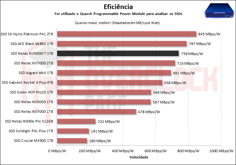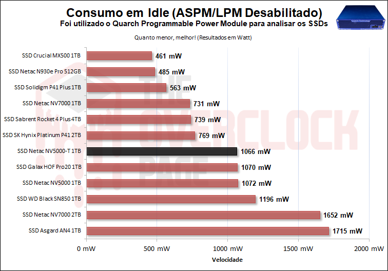 Por último e mais importante, teste em Idle, que é o cenário em que a esmagadora maioria dos SSDs se encontram no uso do dia a dia ou cotidiano, vemos que tanto ele quanto o NV5000 tiveram um resultado similar, o que não foi um resultado muito bom para o NV5000-T.