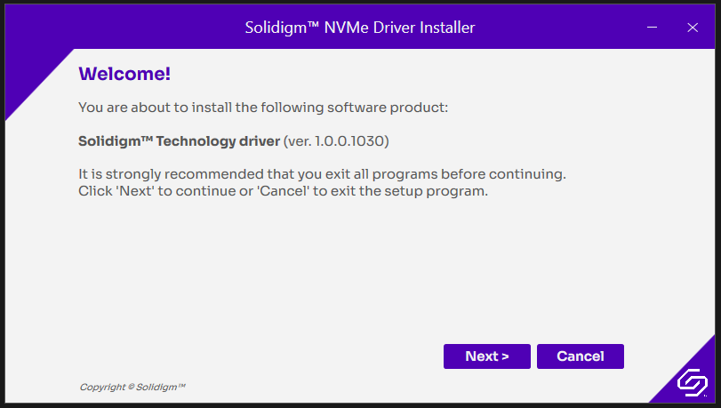 Nesta primeira tela do programa, a Solidigm sugere que feche todos os programas e tarefas que estejam rodando em segundo plano para então prosseguir com a instalação.