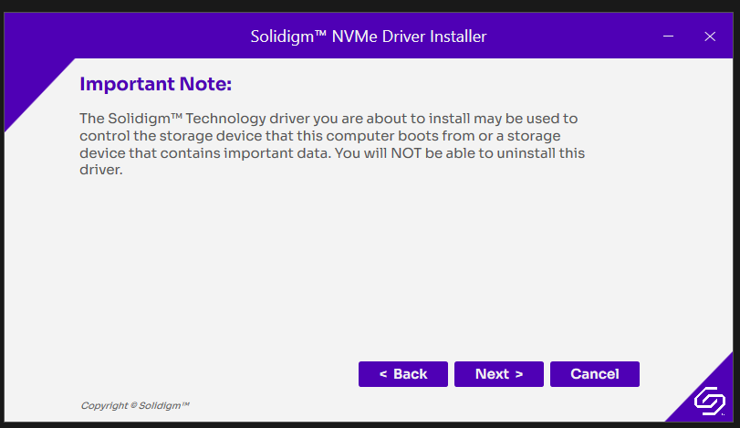 Agora, vamos mostrar o procedimento para instalar este driver NVMe caso alguém possua este SSD, o qual não é possível de se usar com outros SSDs. Pode-se utilizar este driver sem problema algum, entretanto, a Solidigm afirma que não é possível removê-lo.