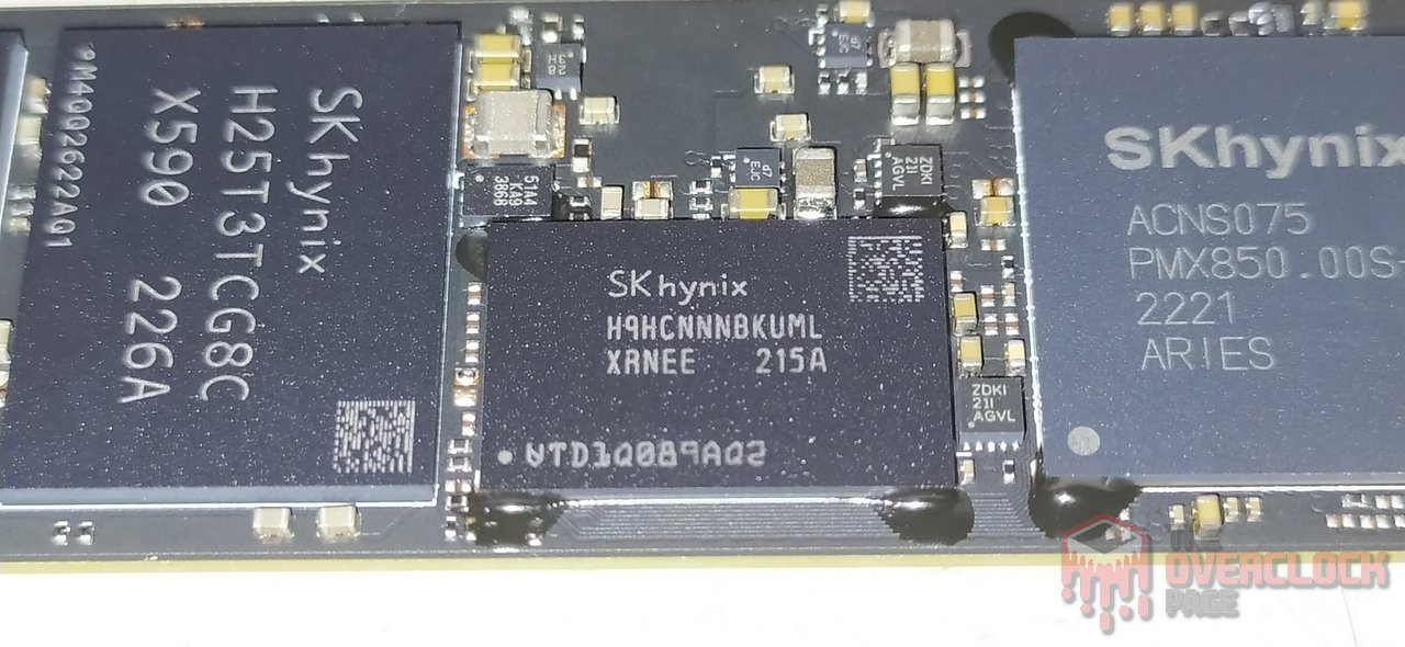 Com relação a seus circuitos integrados de armazenamento, o SSD de 1TB possui 4 chips Nand flashs marcados como “H25T3TCG8CX590” ou “H25T3TCG8C-X590”. Tratam-se de Nands da fabricante norte-americana SK Hynix, modelos 4D TLC V7 sendo neste caso dies de 512Gb (64GiB) contendo 176-Layers de dados.