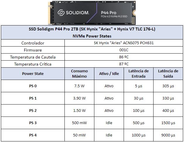 Novamente, vemos que ele possui especificações idênticas ao P41 da SK Hynix, pois seus power states possuem estados idênticos a este P44 Pro, até mesmo em suas latências de entrada e saída.