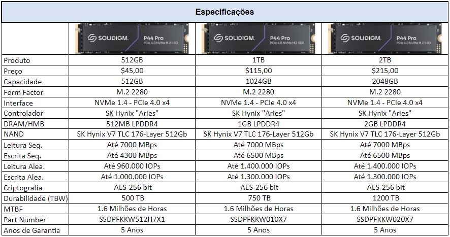 Ele vem no formato M.2 com barramento de 64Gbps, ou seja, 4 linhas PCIe 4.0, protocolo NVMe 1.4 e capacidades que variam desde 512GB até 2TB apenas, sem versões de 4TB. Seu preço geralmente se encontra próximo dos US$215, sendo bem abaixo do Platinum P41 e seus U$260. Outro ponto positivo, é que a Solidigm comercializa este SSD em mais regiões que a SK Hynix, entretanto, ainda não o encontramos no Brasil.