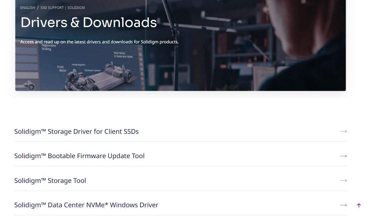 Após nos dirigirmos para o site da Solidigm, devemos selecionar a aba de Drivers e downloads.