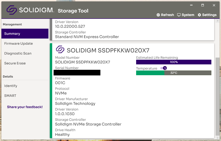 A Solidigm oferece softwares para seus SSDs, o Soligidm Synergy™ Storage Tool,o qual permite gerenciar seus SSDs, checar informações do Smart do SSD, realizar Secure Erase, o que é bem prático, sem ter a necessidade de ter de usar programas de terceiros e por fim, permitir atualizações de Firmware.