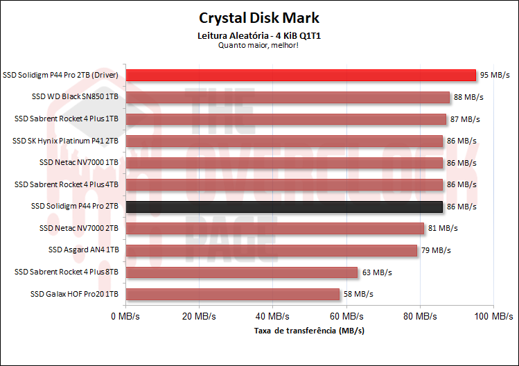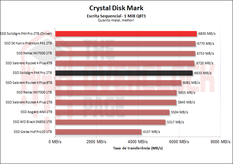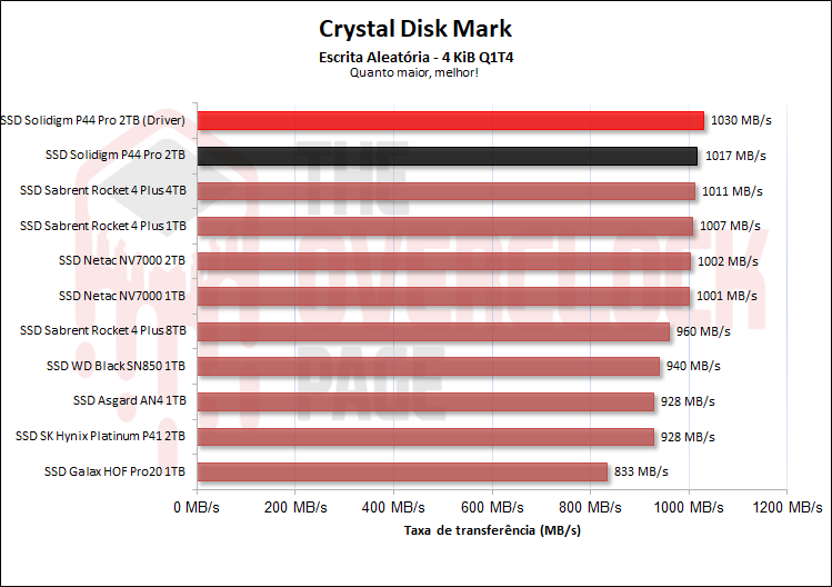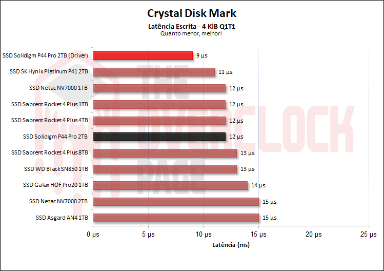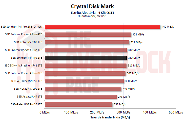 Ao comparamos suas velocidades de gravação pos pSLC Cache com os demais SSDs, vemos que ele não consegue alcançar o Rocket 4 Plus de 4 TB devido as limitações da Solidigm, mas ainda sim conseguiu obter um excelente resultado com um design bem otimizado, o que com certeza é mais do que suficiente para qualquer workload que fora utilizado.