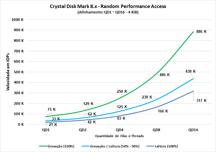 Neste teste, foram feitas 3 configurações de acessos entre diversas configurações de queue depth desde QD1, que representa um uso cotidiano do dia a dia, quanto QD16, que já se torna bem surreal, mais comparável com ambientes virtualizados.
