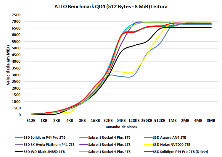 Realizamos um teste utilizando o ATTO para observar a velocidade dos SSDs em determinados tamanhos de blocos diferentes. Neste benchmark, foi configurado da seguinte forma: