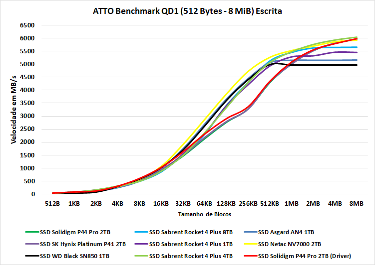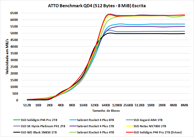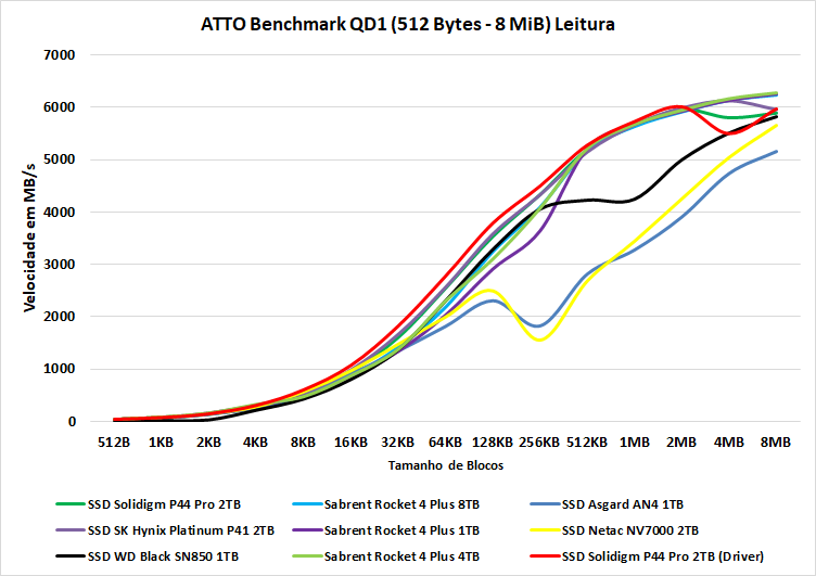 O ATTO disk benchmark é um software que faz um teste de velocidade sequencial com arquivos comprimidos, ou seja, para uma simulação em uma carga de transferência de dados como no Windows, geralmente vemos algo em torno dos blocos de 128KB à 1 MiB, agora observamos que em sua leitura, principalmente em blocos pequenos ele consegue se sair a frente dos demais SSDs, apenas quando passamos de 256KB que ele perde a liderança para outros modelos.