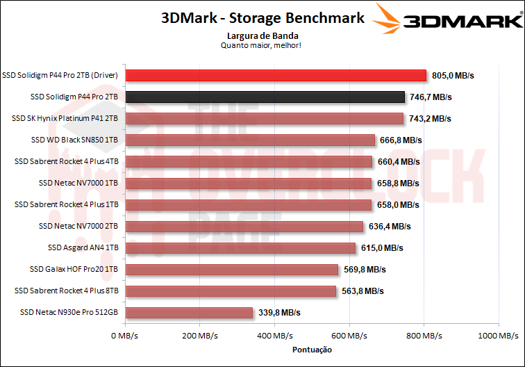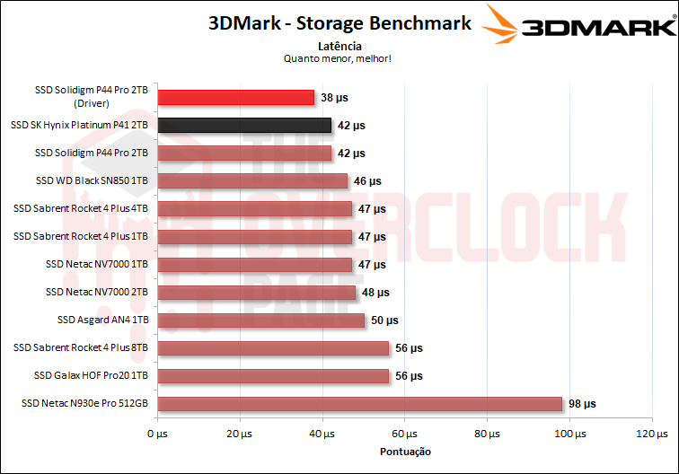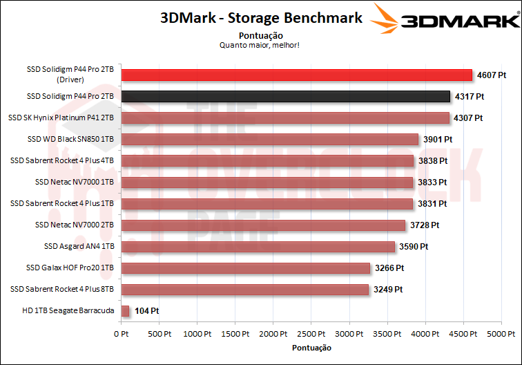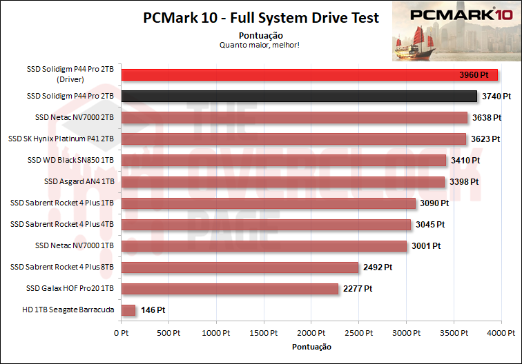 Neste benchmark um pouco mais antigo e menos “otimizado” com um foco maior em produtividade com pacote Adobe e Office, vemos que ele quase chegou a marca dos 4000 pontos. Obtendo mais de 300 pontos a frente do SK Hynix P41 e mesmo sem usar o driver NVMe, ainda sim o ultrapassou