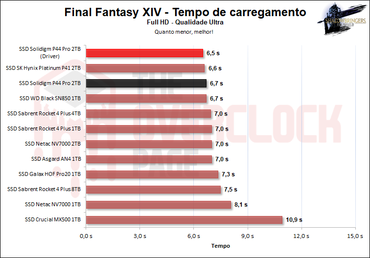 Neste benchmark do Final Fantasy, aonde cada setor do benchmark é calculado o tempo médio estimado que cada cena levou para ser carregada, vemos que o Solidigm teve um excelente resultado, entretanto os demais SSDs neste comparativo tiveram uma diferença muito pequena devido ao fato do game não usar a API do Direct Storage.