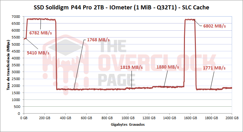 Através do IOmeter, podemos ter uma ideia do volume de SLC cache deste SSD, já que o fabricante muita vezes não informa este valor. Pelos testes que realizamos, foi possível constatar que ele possui um volume de pSLC Cache híbrido, cerca de 312GB, que conseguiu manter velocidade média de ~ 6640 MB/s até o fim do buffer, o que foi um ótimo resultado.