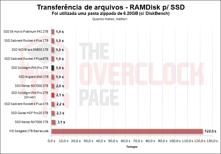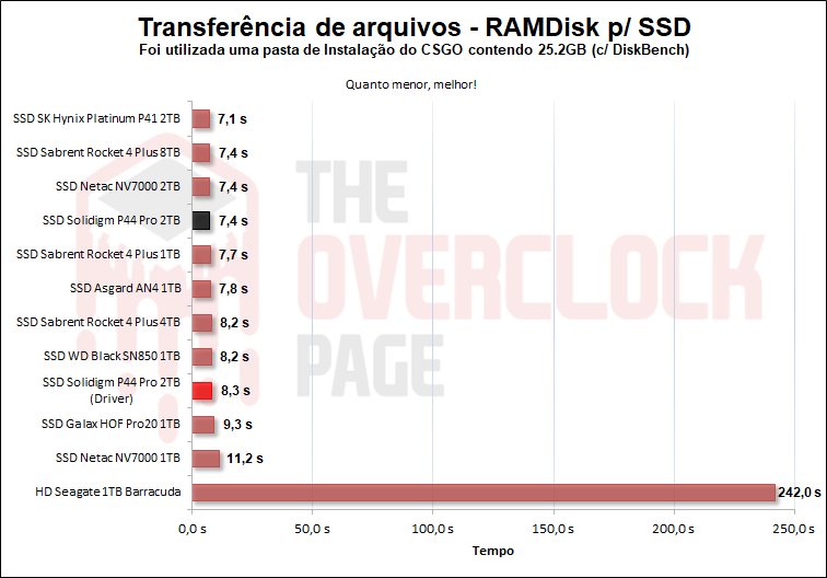 Já ao utilizarmos a pasta do CSGO sendo muito maior, vemos que a diferente entre os SSDs aumentaram e o Solidigm novamente ficou com um empate técnico com o Rocket 4 Plus de 8TB