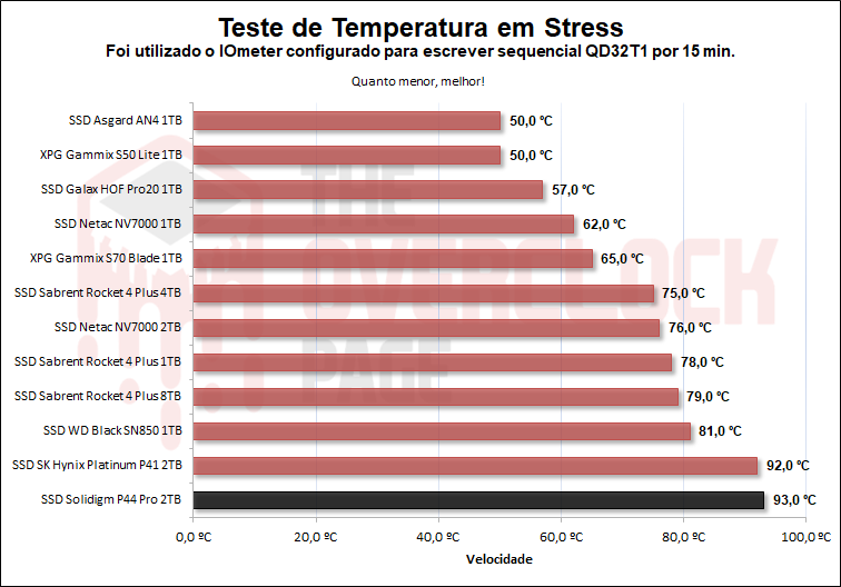 No teste de estresse, vemos que ele chega a bater 93?°C,o qual é uma temperatura muito elevada e o SSD acaba sofrendo throttling severo, porém, devido ao fato da Solidigm ter aparentemente limitado a velocidade das NANDs, ele acaba não tendo uma queda em seu desempenho.