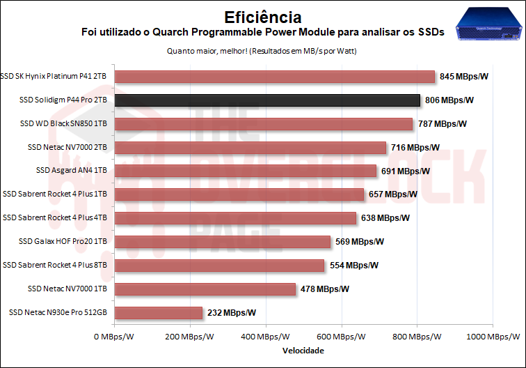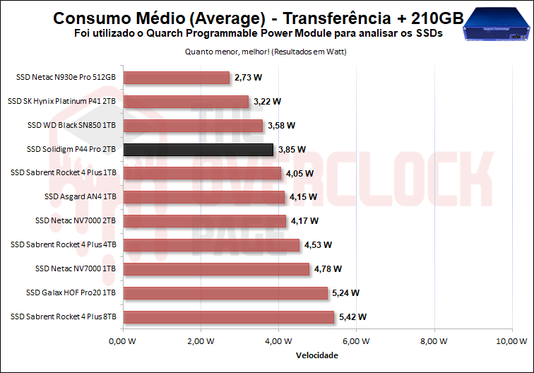 Já em sua média, ao realizarmos uma transferência de mais de 210GB vemos que ele teve um consumo um pouco mais elevado que o SK Hynix, e por isso ele acabou tendo uma eficiência um pouco menor apenas.