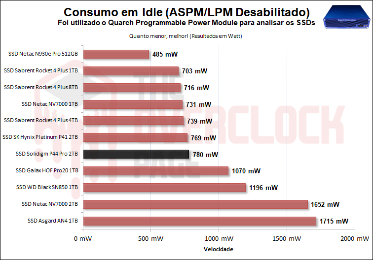 Já em Idle que é o power state que os SSDs se encontram pela maioria do tempo vemos que ele teve um consumo idêntico ao SK Hynix P41 Platinum.