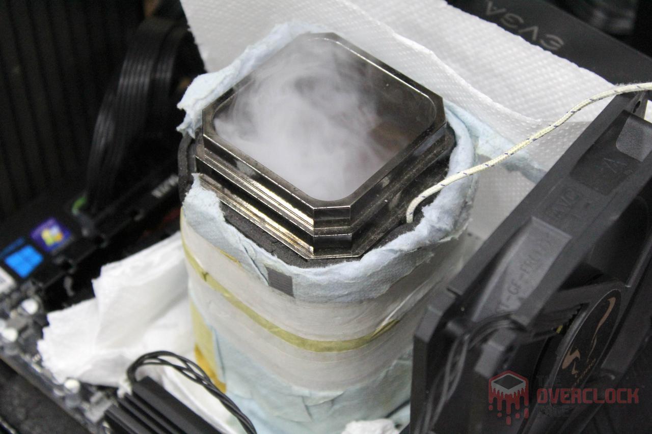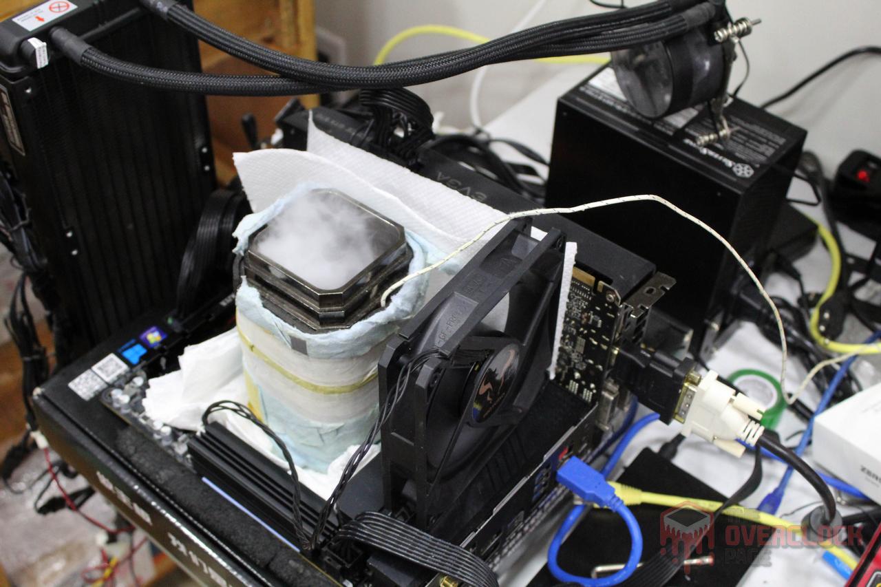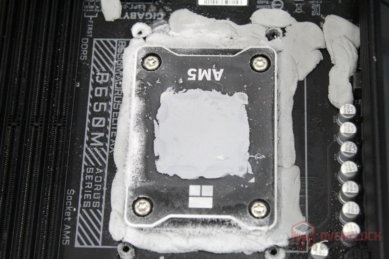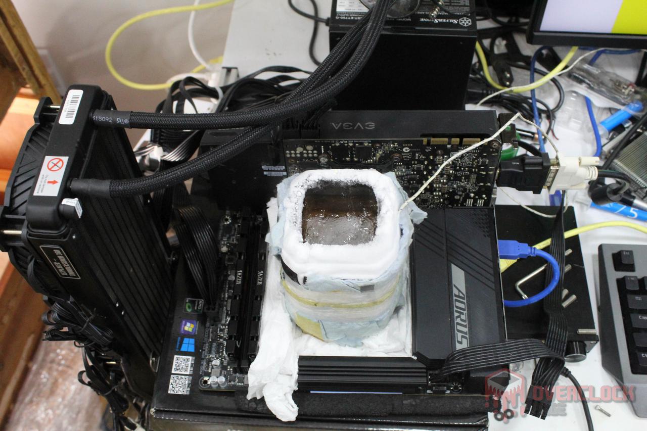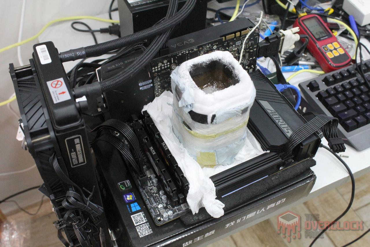 Finally, we have the traditional photo gallery of the fully frozen hardware, something that can never be missing in a post about extreme overclocking! Note that the pot was “assembled” only using gravity, since the mounting screws are incompatible with the thread used in the AM5 backplate.