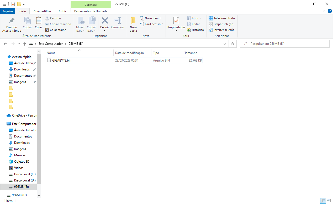 O primeiro passo para usar o “Q-Flash Plus” na B650M Aorus Elite AX é arranjar um pendrive adequado e formatá-lo no padrão FAT32. Feito isso, baixe o arquivo da BIOS do site do fabricante, extraia, renomeie o arquivo da BIOS para “GIGABYTE.bin” (sem aspas) e coloque na raiz do pendrive.
