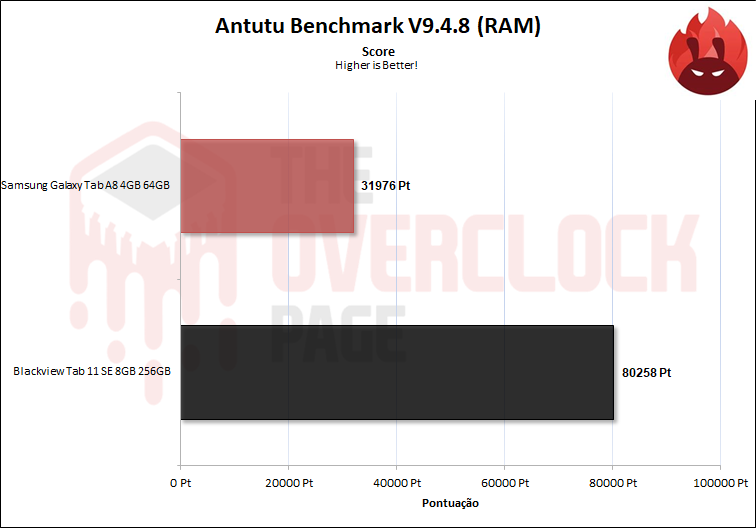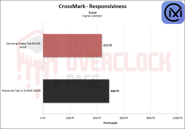 Neste benchmark, novamente, o tablet apresentou um resultado muito similar ao Samsung Tab A8, que encontramos no Brasil por cerca de R$1.300 à R$1.500, sendo que apenas no quesito de responsividade ele conseguiu uma leve vantagem, muito provavelmente devido a sua maior quantidade de memória RAM, pois 4GB de memória em dispositivos Android hoje em dia é apenas o mínimo adequado.