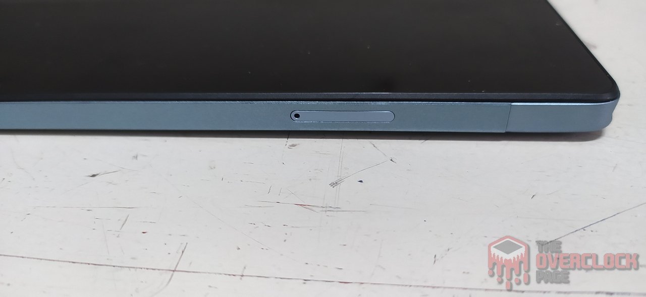 No outro lado do tablet, encontramos o slot para cartão SD junto do slot de cartão SIM, onde ele permite SD de até 1TB microSDXC que compartilha o espaço com outro slot de SIM, portanto ele permite ou 2 SIM, ou 1 SD Card e um SIM.