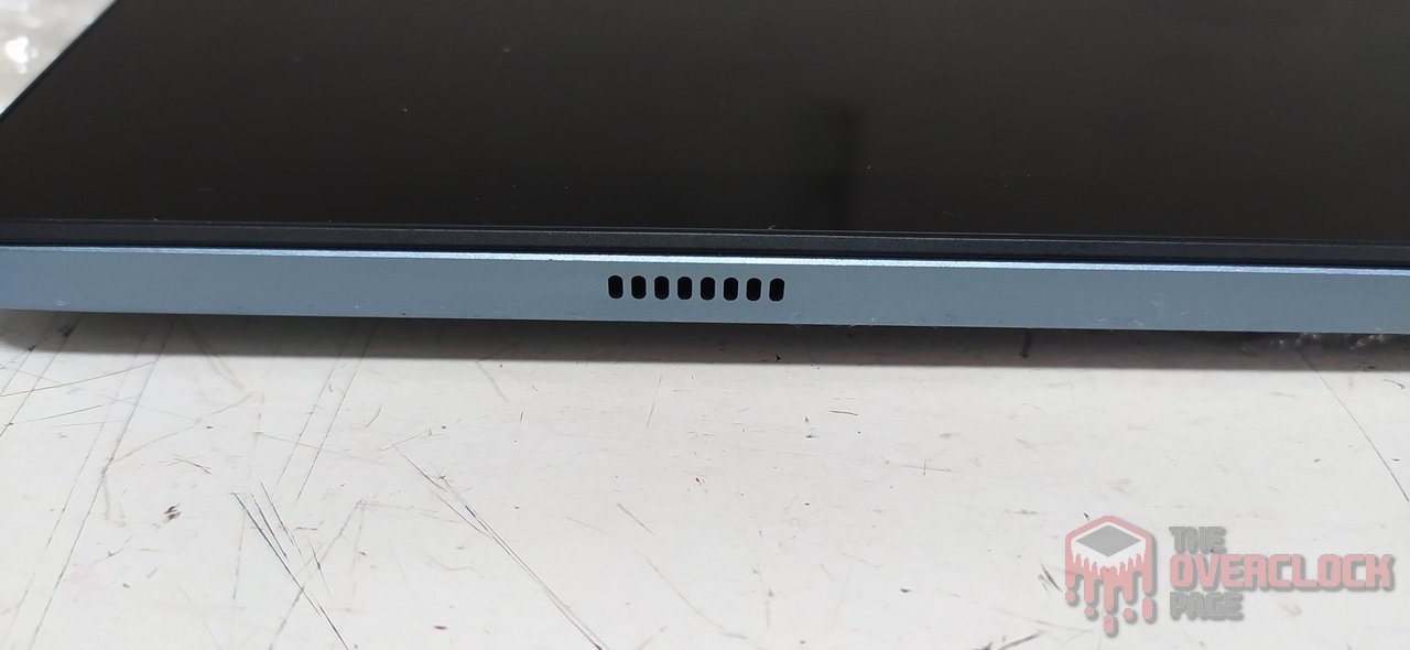 Ele oferece um conector de 3.5mm para fones de ouvidos/microfones e ao lado dele, temos 3 botões, Volume +, Volume – e o botão Power. Logo em seguida, vemos o conector USB tipo-C para carregamento e transferência de dados e por último, temos duas furações para os speakers do Tablet.