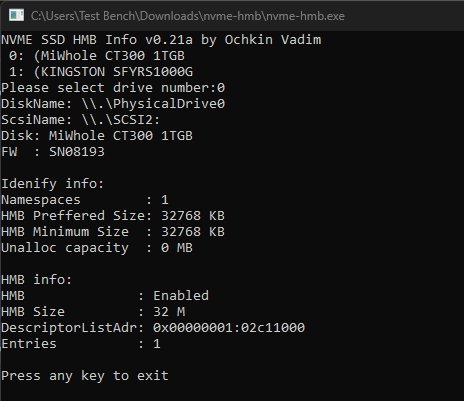 Como havíamos mencionado, por se tratar de um controlador DRAM-Less, ele não oferece suporte a DRAM Cache, portanto, para realizar o armazenamento da tabela de metadados, ele aloca 32 MiB da memória RAM do sistema para agilizar o acesso a esta tabela.