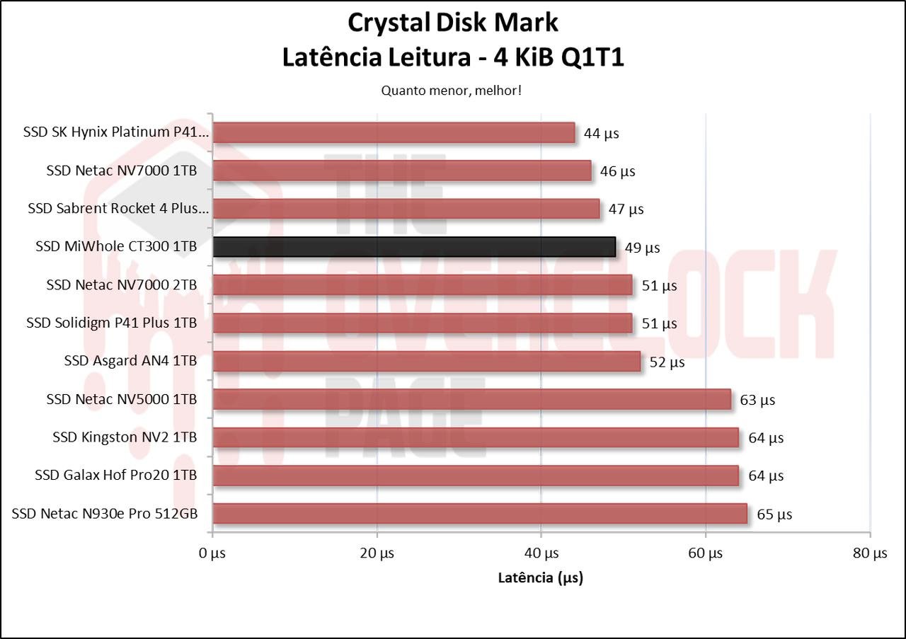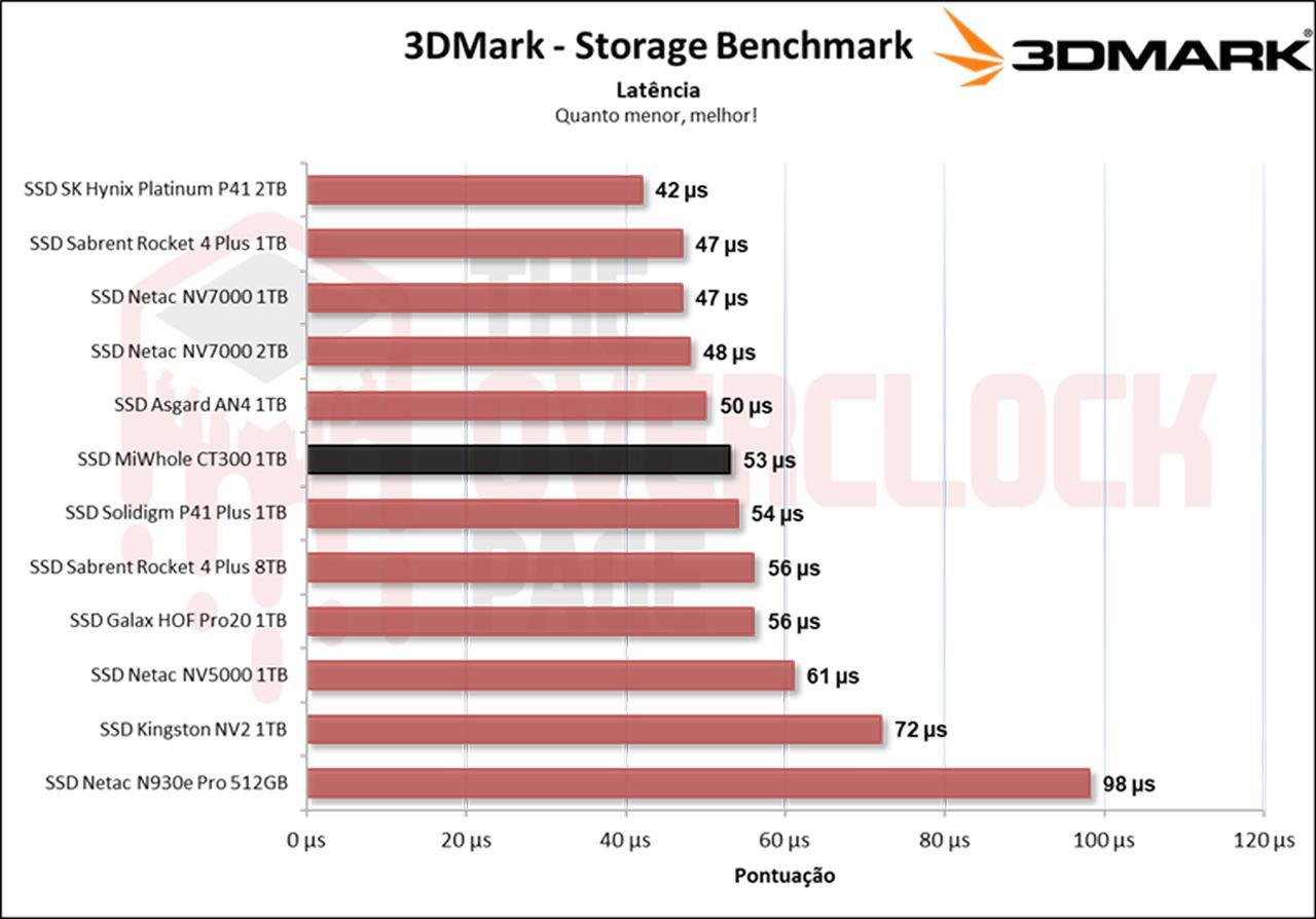 Vemos que neste benchmark, com traces mais realistas e tradicionais de uso cotidiano, o novo MiWhole CT300 apresentou um desempenho apenas um pouco inferior ao Asgard AN4 e o NV7000 de 2TB, isto ocorreu devido à largura de banda e a latência deste SSD DRAM-Less ter sido levemente inferior a estes demais SSDs.