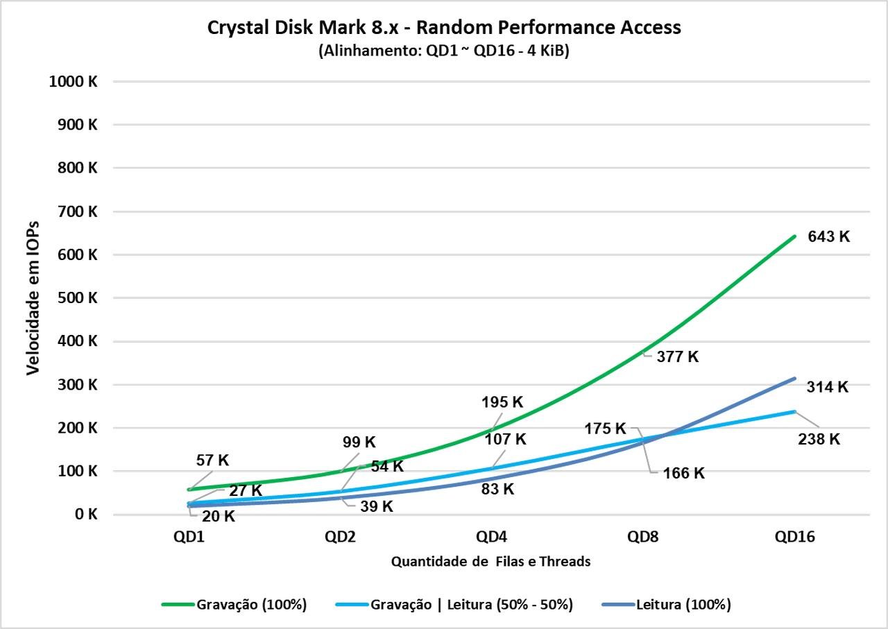 Neste teste, foram feitas 3 configurações de acessos entre diversas configurações de queue depth desde QD1, que representam um uso do dia a dia, quanto QD16, que já se torna bem surreal, mais comparável com ambientes virtualizados.