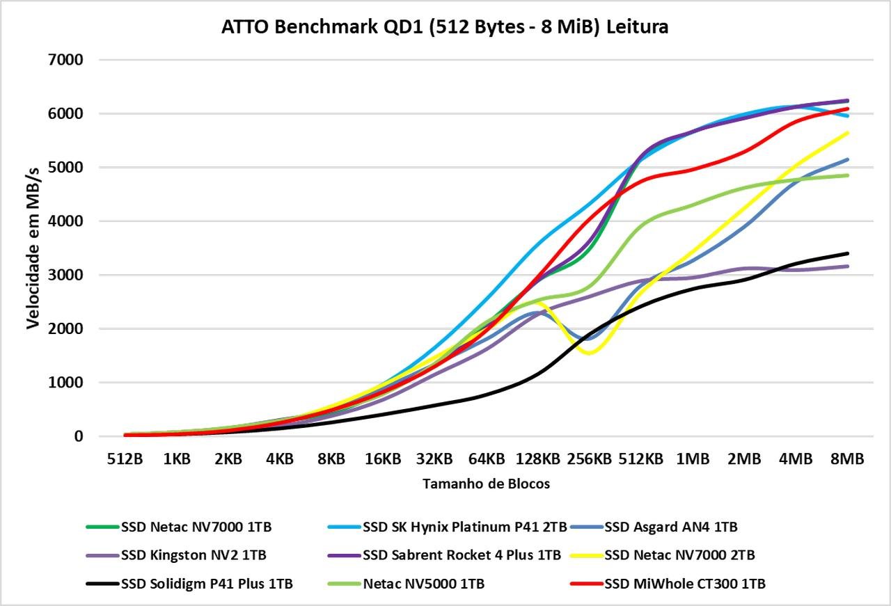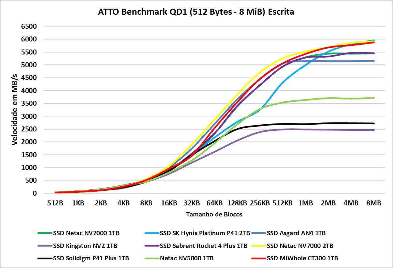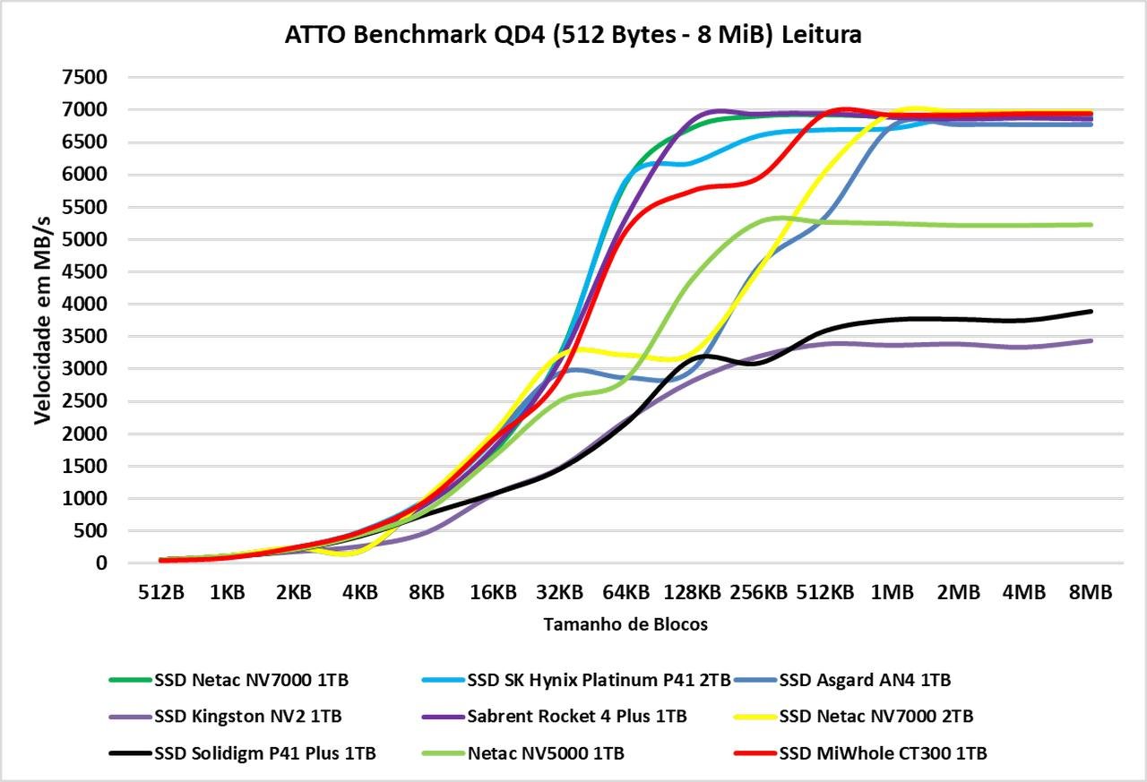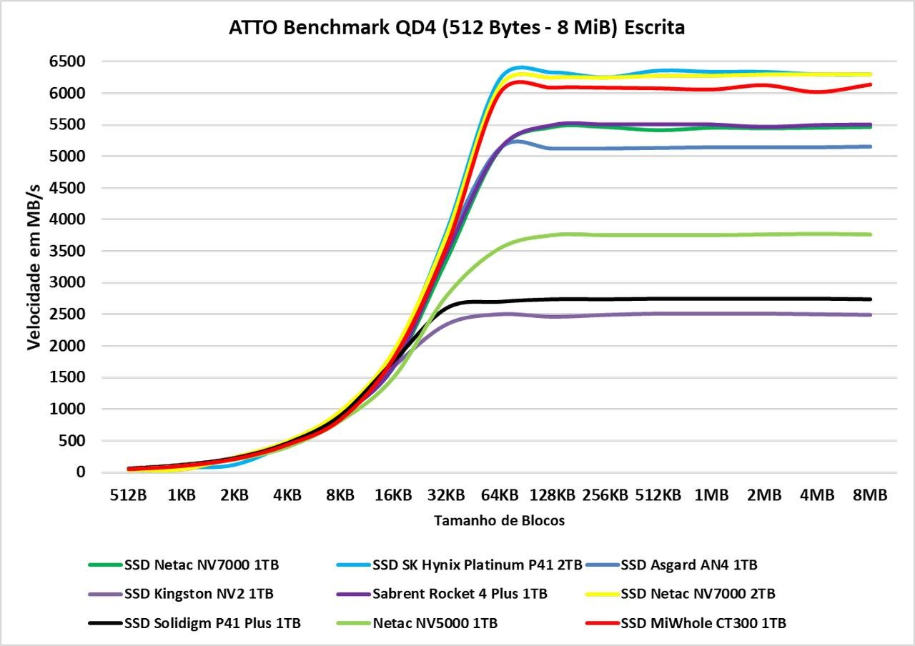 O ATTO Disk Benchmark é um software que faz um teste de velocidade sequencial com arquivos comprimidos, ou seja, para uma simulação em uma carga de transferência de dados como no Windows, geralmente vemos algo em torno dos blocos de 128KB à 1 MiB, agora, em blocos de menor tamanho, ele oferece um desempenho semelhante aos demais SSDs, conforme os blocos vão aumentando conseguimos ver a real diferença. E neste teste, a partir de 16KB vemos que ele começa a perder posições para demais SSDs Gen4, porém após 512KB ele volta ao topo novamente.