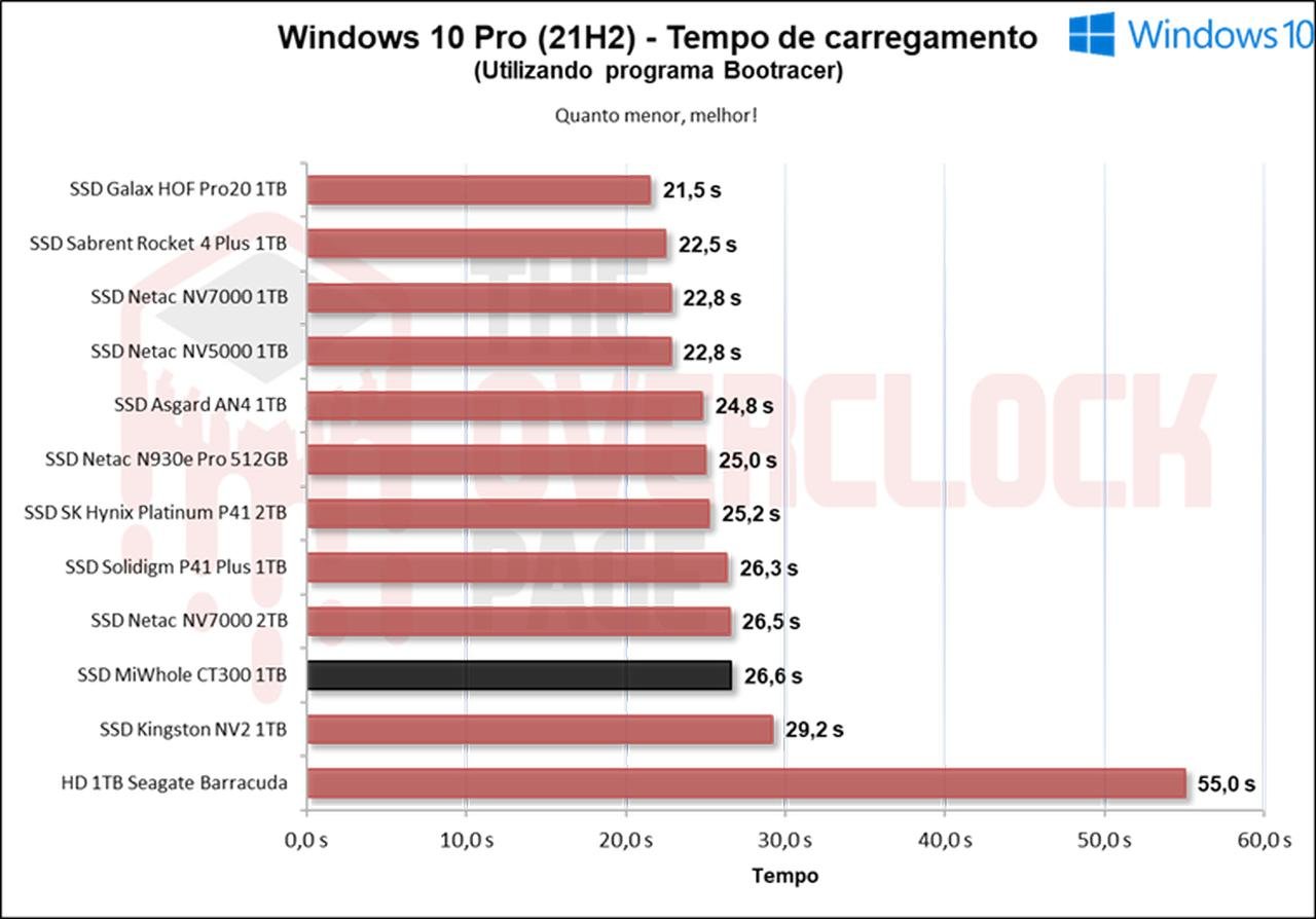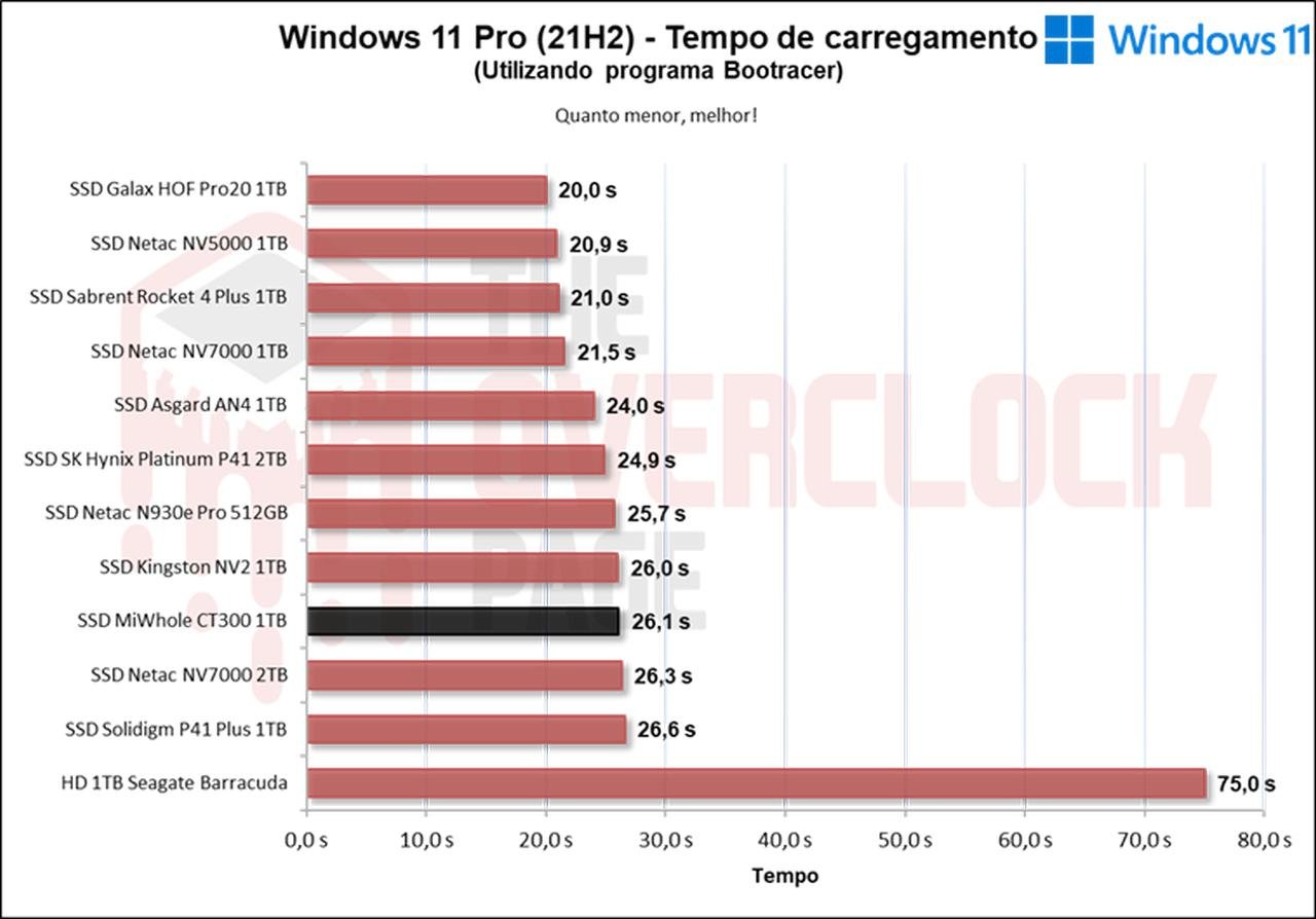 Neste programa, consta deste o tempo de boot até o carregamento dos últimos drivers do OS, o que neste caso, é feito uma instalação limpa com apenas drivers de sistema operacional, como de Rede, Wireless + Bluetooth, Áudio, Drivers Nvidia, PCH dentre outros, então, podemos observar que o MiWhole apresentou resultados satisfatórios, cujo foram próximos de outros SSDs 4.0 de entrada como o P41 Plus e o Kingston NV2, entretanto ficando para trás do NV7000 e Asgrd AN4.