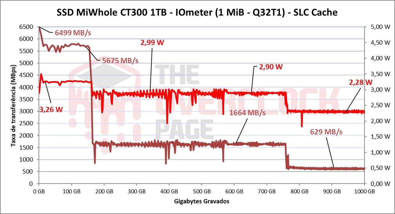 Através do IOmeter, podemos ter uma ideia do volume de SLC cache deste SSD, já que o fabricante muita vezes não informa este valor. Pelos testes que realizamos, foi possível constatar que ele possui um volume de pSLC Cache que aparenta ser dinâmico, de cerca de 165GB, ele conseguiu manter velocidade média de ~ 5689MB/s até o fim do buffer, o que foi uma velocidade boa considerando que essa é uma unidade SSD PCIe 4.0 de 1TB.