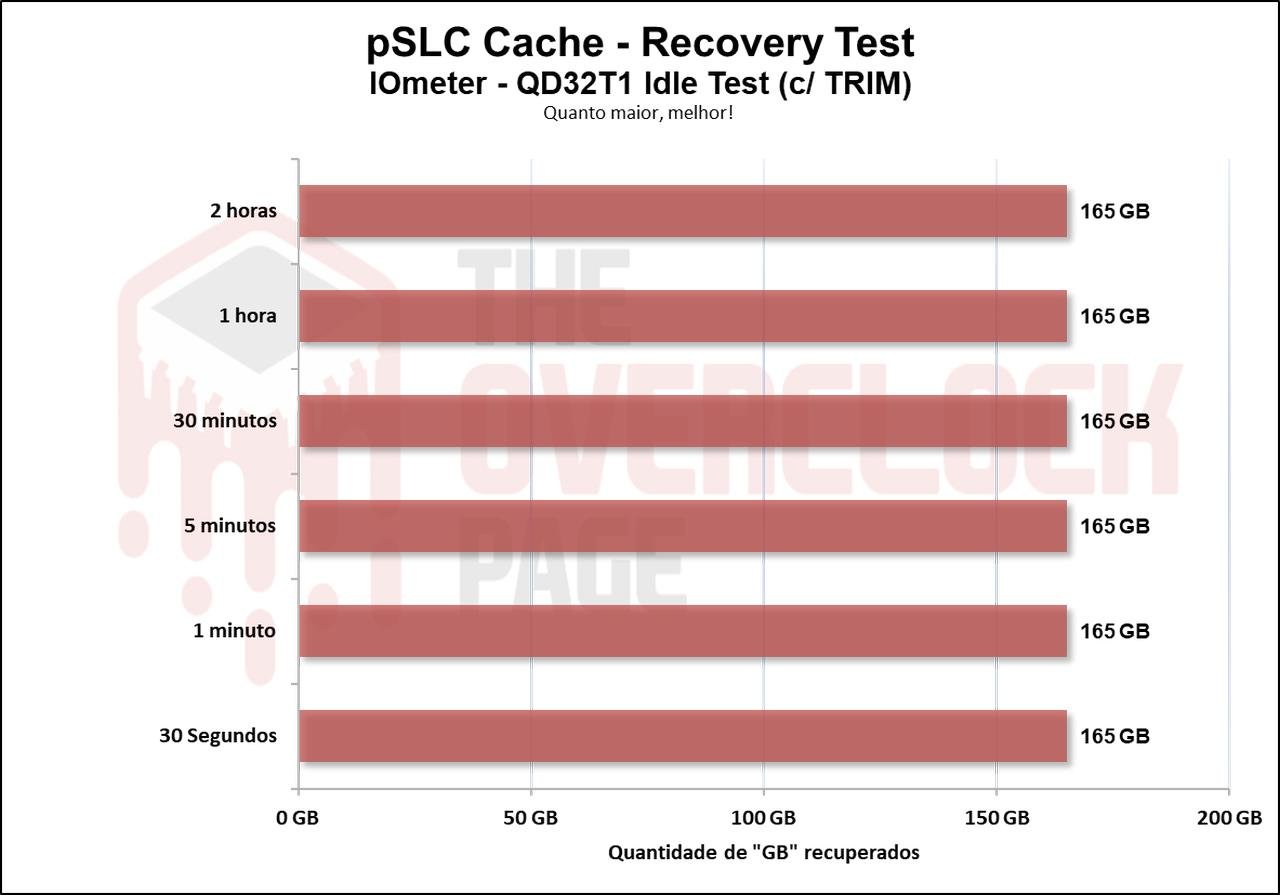 Realizamos também um teste para ver quanto tempo o SSD levaria para recuperar parte de seu Buffer e no decorrer da nossa bateria de testes, que dura de 30 segundos até 2 horas em idle, utilizando o TRIM e gargabe collection vs TRIM/GC não utilizados. Ao testarmos sem usar o TRIM/GC podemos observar que ele conseguiu recuperar cerca de 21GB à 33GB em cerca de 30 segundos em idle, infelizmente, mesmo após 2 horas em idle ele não conseguiu recuperar mais do que isto. Entretanto, foi um resultado ótimo.