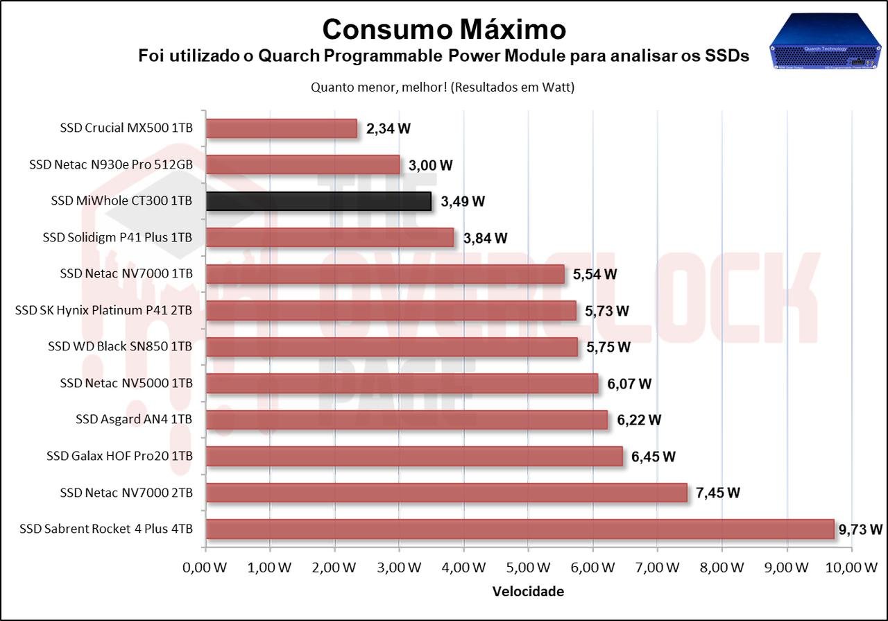 Com relação a seu consumo máximo, podemos observar que ele teve uma diferença grande em comparação aos demais SSDs Gen4 que tiveram um consumo muito maior que este CT300.