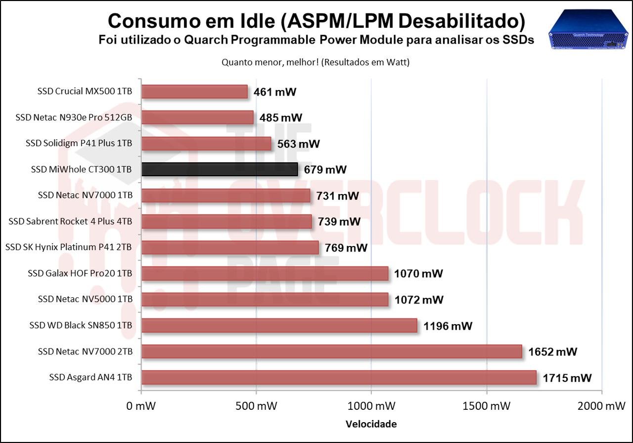 Por último e mais importante, teste em Idle, sendo o cenário em que a esmagadora maioria dos SSDs se encontram no uso do dia a dia ou cotidiano, vemos que ele novamente não deixou a desejar, tendo o menor consumo dentre os SSDs de 7000 MB/s.